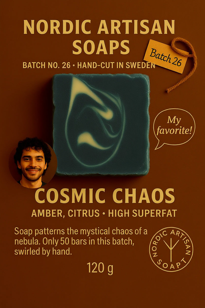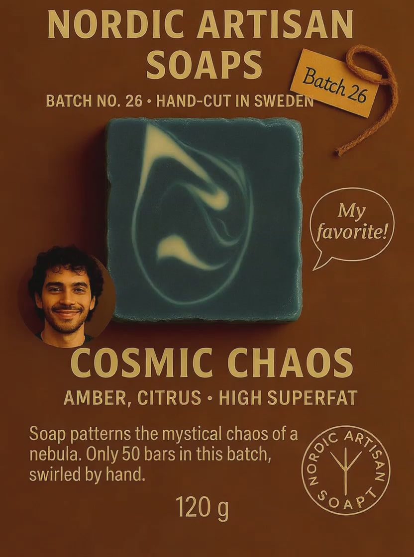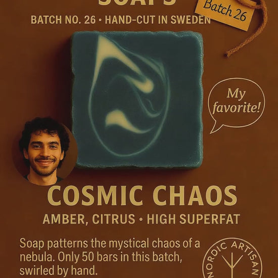 Discover the bold warmth of Cosmic Chaos, a signature bar from our Art Series. Each soap is individually poured by hand in Sweden, creating a one-of-a-kind swirling pattern that’s as unique as the scent itself.