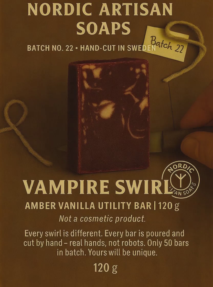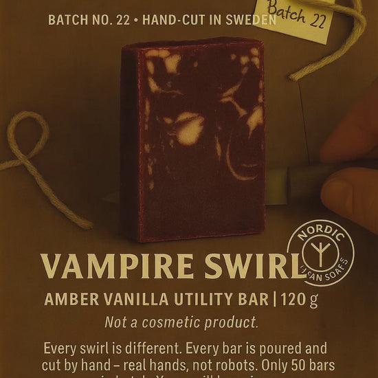 Djup röd tvål med dramatiska swirls i vitt. Bjuder på en förförisk doft av amber vanilla – blommig, mjuk och subtilt fräsch, perfekt för den som vill ha något annorlunda vid handfatet.